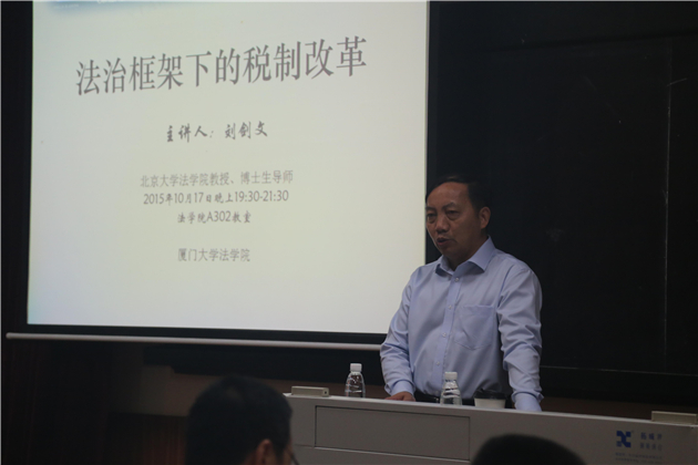 2015年10月17日晚上7点30分,“法治框架下的税制改革”的主题讲座在法学院A302教室举行,主讲人为北京大学法学院教授、中国财税法学研究会会长刘剑文教授。本次讲座由法学院副院长朱炎生教授主持,法学院的诸多老师、学生全程听了此次讲座。此外,本次讲座还吸引了厦门市国税局的领导与职工前来参加。