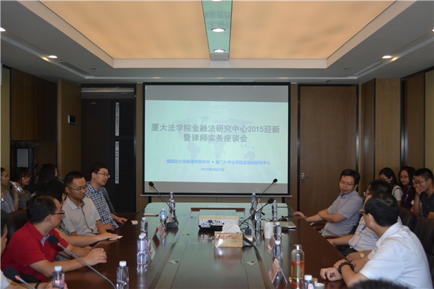 中秋佳节日,金融迎新时,2015年9月27日,农历中秋佳节来临之日,“pc28开奖结果预测官网刮刮乐金融法研究中心2015迎新暨律师实务座谈会”在福建远大联盟律师事务所隆重举行。厦大法学院刘志云教授、阳建勋副教授、毛海栋博士、王俊博士,福建远大联盟律所陈继东主任、李毅阳律师、邹亿律师,以及厦大法学院“金融法方向硕士班”校外导师郭伟红老师,福建天象律师事务所张建平主任等出席了座谈会。金融法研究中心50余名博士生、硕士生参加了此次活动。