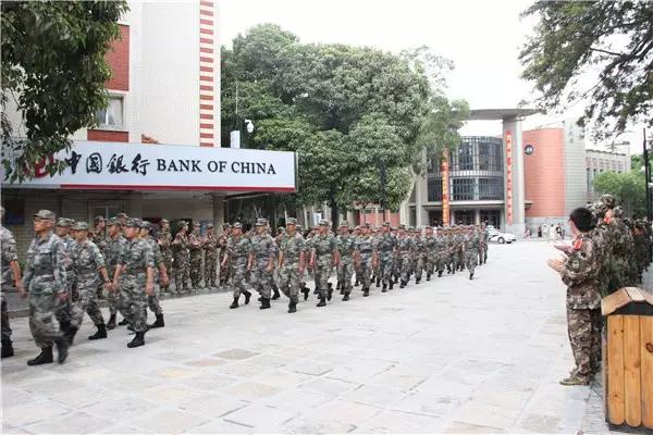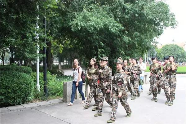 28日一早,在校园主干道上,2015级新生们排着整齐的队伍,迎接承训官兵。法学院2015级新生排列在三家村广场的道路两侧,鼓掌呐喊表示对教官们的欢迎。