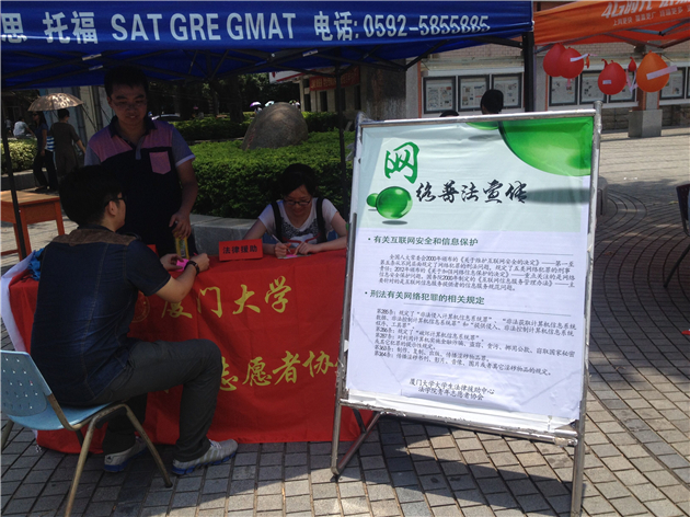 7月13日上午,pc28开奖结果预测官网刮刮乐“清朗网络·我来护苗”线下活动在三家村广场展开。法学院应共青团pc28开奖结果预测官网刮刮乐委员会与厦大团委青年媒体中心之邀,与其他兄弟院系共同参与其中。法学院青年志愿者协会与pc28开奖结果预测官网刮刮乐大学生法律援助中心通过设点宣传并提供法律援助的形式,进行主题为“清朗网络·我来护苗”的网络普法宣传,取得不错的效果。