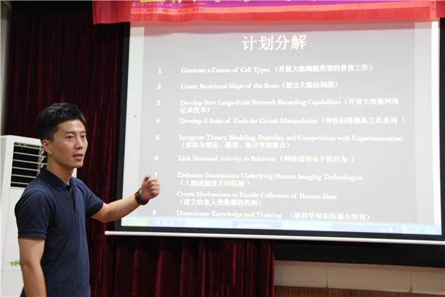 其次,吴老师对神经科学进行了解释。他提出奥巴马的“脑计划”,将其分解为九大部分,认为该计划大致展现了神经科学的路线和内容,并对其进行了细致的讲解。比如,大脑结构图与群体和个人数据的匹配相关,大脑容量的开发与认知加强相连。在这个过程中,吴老师结合自己在国外学习的经历,对国外神经科学的相关课程进行了介绍,既有法律与神经科学等基本内容,也有关于决策、证据、磁共振等内容,认为国外课程都很有趣,并重点介绍磁共振研究中心,对磁共振扫描实验室、仪器和存在的问题都作了全面展示。