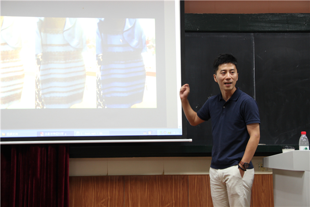 首先,吴老师对神经科学进行了简单清晰的界定。他认为,神经科学是专门研究神经系统的结构、功能及发育、演化的一门科学。简明扼要的说,就是大脑的“读”与“写”。对此,吴老师以引发广泛讨论的“蓝黑白金裙”为例开展了详细的解说。他提出,由于信息的不确定性,大脑会对信息作出不同的组合,致使观察主体对裙子的颜色有不同的认知。为了使大家有切身的体验,吴老师现场开展了著名的心理学实验:“看不见的大猩猩”。这项实验告诉我们,由于关注和观察的方面不同,人们会忽视很明显的信息。特别是在现今信息爆炸的时代,各种信息充斥在我们的周围,生活中的“大猩猩”无处不在,却被我们忽视。所以,我们看到的不一定是“真实”的。对此,吴老师通过一则模拟犯罪现场的视频,向我们详细展示了有关信息遗失的问题。在座的师生惊叹连连,深深为之吸引。