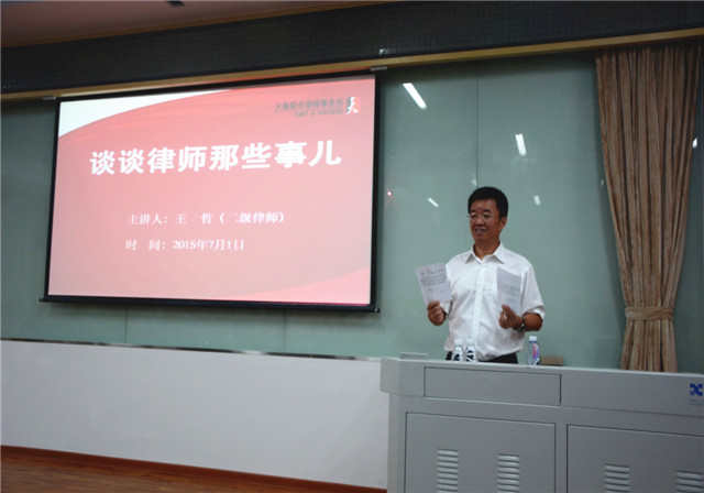 2015年7月1日下午15:00,我院B137迎来了“法律高级实训课程”第四场讲座——“谈谈律师那些事儿”,本次讲座嘉宾为福建天衡律师事务所资深律师王哲。研一全体实训课程学员参加了本次讲座,王律师丰富的执业经验让各位学生充满了期待。