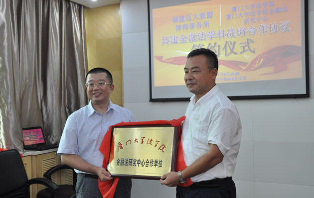 福建远大联盟律师事务所作为一家稳健经营的综合性律师事务所,总部位于厦门,在龙岩和漳州设有分所,目前有八十多名执业律师,职员总数近百人,是海西区域较大的律师事务所之一,连续五年荣获省级优秀律师所称号,积累了丰富的客户资源、技术研发和市场实践经验。厦大法学院和金融法研究中心教学研究力量雄厚、成果显著、精英人才辈出,多年来为金融法律制度完善和金融现代化建设做出重要的贡献,在社会各界具有很强的专业美誉度。我们有理由相信,两者的合作必将为金融法的研究与实践以及律所的金融法律业务注入一股新的、强大的力量,期待远大联盟律师事务所与金融法研究中心齐心协力、求实创新、深入合作、实现共荣共赢。