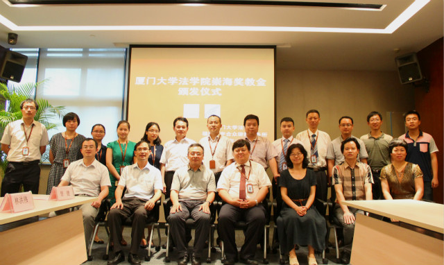 在接下来的颁奖仪式中,我院周赟老师、吴旭阳老师和陈丽清老师因分别在教学、科研和行政方面表现突出,荣膺此次崇海奖教金。我院李智勇书记,周蕾、郭锦星副书记以及律师事务所涂崇禹、曾建主任共同为获奖教师颁奖。