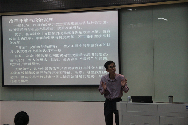 讲座开始前,主持人魏磊杰老师简要介绍了吴毅教授的学术背景和学术成就,并与大家分享了他对本次讲座主题的前理解。魏老师指出鉴于政治演进在很大程度上具有路径依赖的特征,所以应在连续的制度统中认识和理解具体政制。具体到当下,建国以来的前后三十年不应相互否认,而应做历史接力式的贯通评价。演讲开始后,吴毅教授首先通过对讲座题目的剖析,向大家说明了本次演讲的主旨——即从政治发展的角度,分析改革开放以来中国大陆政治发展的趋势与特征。切入正题后,吴教授首先反驳了关于改革开放三十多年来,中国大陆经济与社会改革超前,但政治改革滞后的流俗观点。他锐利地指出,在中国这样一个典型的社会主义国家,任何经济与社会改革,必定首先是一种政治改革,没有政治改革,便不可能有经济与社会改革;“政治改革滞后说”,很可能只是源于论说者对于政治改革的认识,与执政者的认识并不一致,亦未必是一种站得住脚的学术观点。