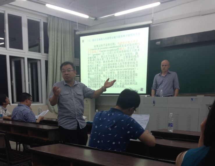 本次讲座是意大利语授课,由徐国栋教授翻译。徐老师首先对贝特鲁奇教授的到来表示热烈欢迎,并做了开场致辞,整场报告在轻松愉悦的气氛中进行。首先,贝特鲁奇教授阐述了本次讲座所要讲解的内容。一共分为四个部分:一是关于银行无因担保的起源通说;二是钱庄主承保;三是优士丁尼法中的新的无因担保;四是在意大利法和其他欧洲法中的无因担保合同的痕迹。贝特鲁奇教授通过对银行无因担保的起源的梳理,对罗马法上的银行无因担保制度进行考察,得出了这样的结论:“一些来源于罗马法的制度,在现在也是非常有用的,可能在当今很多领域达到公平的目的,如无因担保合同。”之后是同学们的提问环节,同学们踊跃提问,就无因担保的相关问题做了发问,本特鲁奇教授一一作答,徐国栋教授也对同学们的精彩发问做了高度认可。