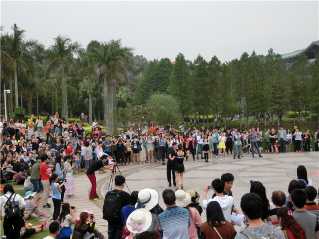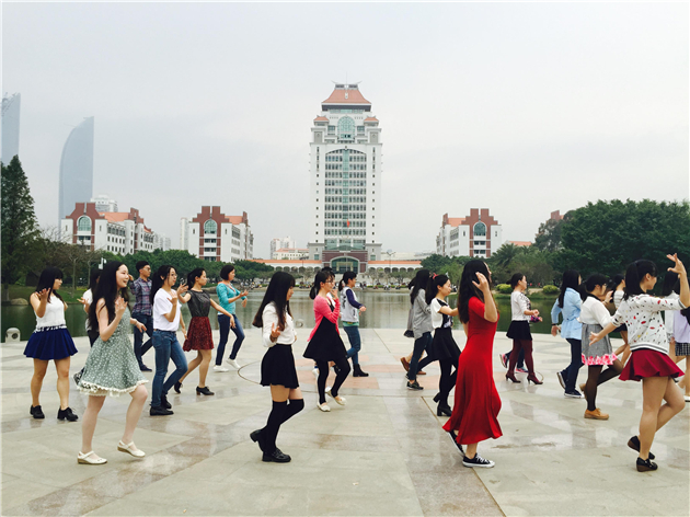 4月18日下午4时18分,音乐响起,伴随律动,两位女同学出现在芙蓉湖广场,和着音乐舞动起来。渐渐的,越来越多的同学进入大家的视线,他们聚集在一起,跟随着音乐,拍打着节奏,翩翩起舞。很快,快闪行动吸引了众多围观师生、游客,大家无一不受到欢快的旋律和同学们青春舞姿的感染,纷纷兴致勃勃地拍照,摄像,甚至跟着音乐一起摇摆。欢声笑语遍布整个广场。