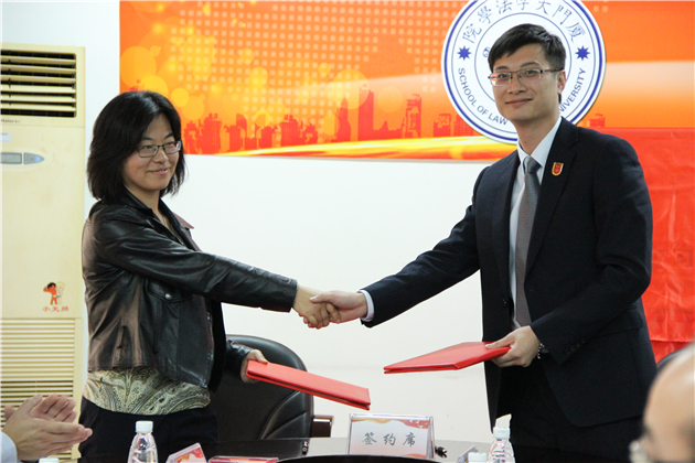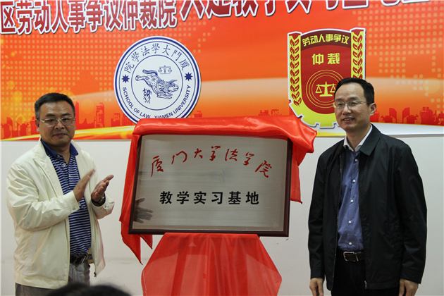 紧接着,法学院党委副书记周蕾与湖里区劳动人事争议仲裁院院长龚晓龙作为双方代表共同签署了共建“教学实习基地”协议。并由湖里区副区长刘琦龙与法学院党委书记李智勇共同揭牌。
