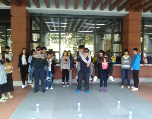 第三个游戏“瞎子背瘸子”则是一场力量与协作的比拼。游戏中,被背的同学须指挥被蒙了眼的同学行走,不能撞到水瓶。男生背女生,女生背女生,男生背男生的精彩场景一次次出现。