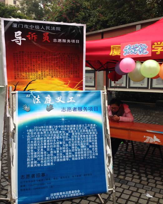 厦门市中院“法庭义工”志愿服务项目是学院2014年新确立的一项新的长期志愿服务项目,工作内容主要为引导群众到法院相关办事场所办理事项、为群众提供沟通交流等服务;“导诉员”志愿服务项目活动是由2009年创办至今逾6个年头的志愿活动,法院以导诉岗位为法律学子提供实践基地,志愿服务者也积极参与导诉服务,该项志愿服务项目从创办来也受到社会各界的广泛关注。在活动期间,有不少同学对法学院的志愿服务项目感到兴趣,纷纷来询问志愿服务的具体内容。