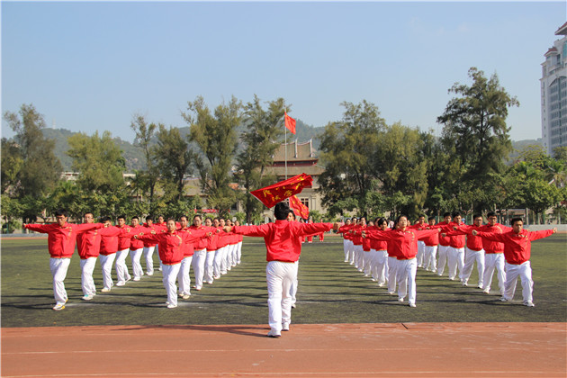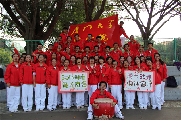 第一个出场的是物理与机电工程学院,其嘹亮的口号声迅速激起了演武场上数百名观众们的热情。他们出色地完成了整套动作,引得全场观众的掌声。作为第五支进场的队伍,法学院47名同学身着红白色的院服,在响亮的口号声中,迈着整齐划一的步伐入场,步伐与口号节奏相互对应。红色的上衣,象征着火一般的热情,更象征着新厦大人积极向上的朝气。踏步、伸展、扩胸、踢腿、转体、弯腰、跳跃,每一个动作都精益求精、刚劲有力,将广播体操的力与美完美地结合在一起,法学院学子们自信坚毅的风采展露无遗,正是“恰同学少年,风华正茂”!最后,在“厦大法律,响彻寰宇;南强学子,再创佳绩”的口号声中,队员们有序退场,赢得了评委和观众们的阵阵喝彩与掌声。随后上场的队伍也不甘示弱,现场气氛也随着比赛的进行愈发热烈。