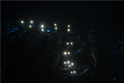 临近尾声,七院工作人员登台为新生们送来一份特别的礼物——暖心节目《星空》。现场观众纷纷打开手机的手电,随歌声举起摇摆,现场霎时成了一片星星的海洋,台上的工作人员也用开启手电的手机摆出“7”的造型。