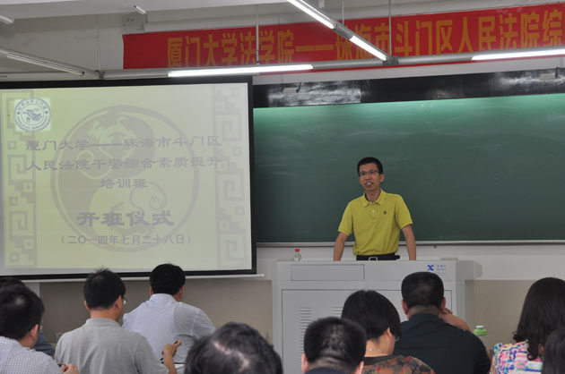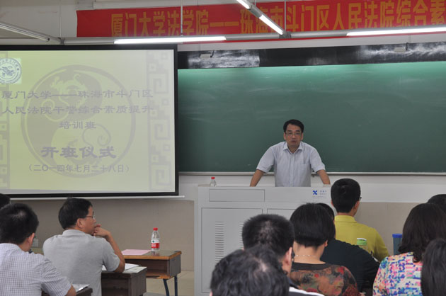 厦大法学院徐崇利院长首先致辞,他代表法学院对远道而来的斗门区人民法院的领导和干警们表示热烈的欢迎,并感谢大家在这个这么炎热的季节抽出时间来厦大学习交流。徐院长在简短介绍了厦大的美和厦大法学院的基本情况后,着重指出来自实务部门的领导和干警们走进校园不光是来学习的,其实也是来指导学校的工作。在几天的上课时间里,不光有老师讲学员听,更有理论和实践的直接碰撞,在互相交流的过程中,偏理论的学校和偏实务的法院都会有不同的收获,这也是由培训工作所具备的特点而带来的双赢效果。徐院长最后希望全体学员们在接下来的几天时间里,学有所获,在厦期间身体健康,生活快乐。