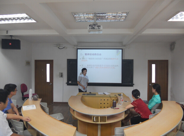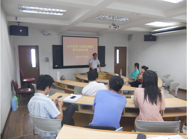 陈鹏老师首先就“宪法学的精神活动的自由”进行讲授,接着郑晓剑老师介绍了广播电视组织权的产生和内容。随后,进入英文教学技能竞赛,周琛老师以流利的英语对“环境政策和法律之公众参与”进行讲授。最后上场的张膑心老师则以理想主义的张力和现实主义的扎实理论将其对人道法的理解娓娓道来。各位老师在短短20分钟的授课时间里尽显教学风采。