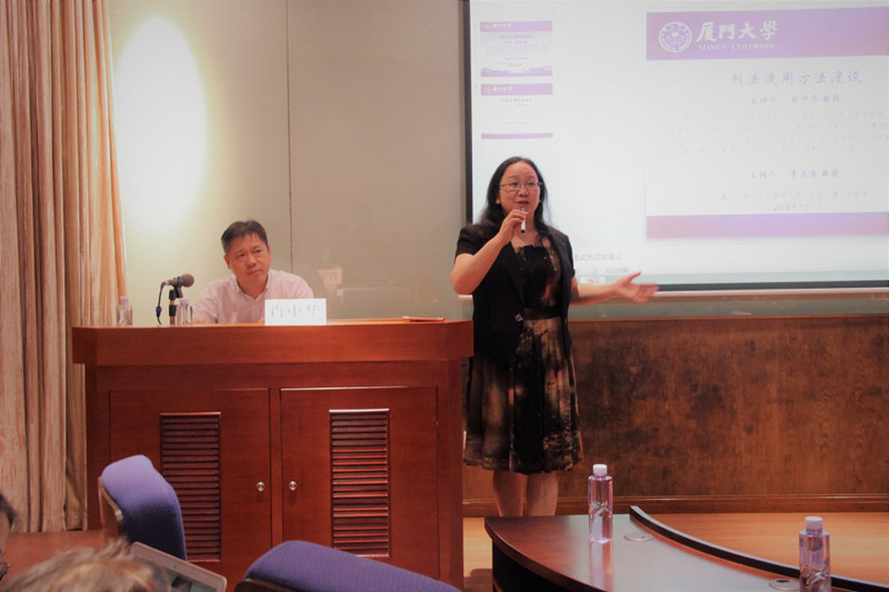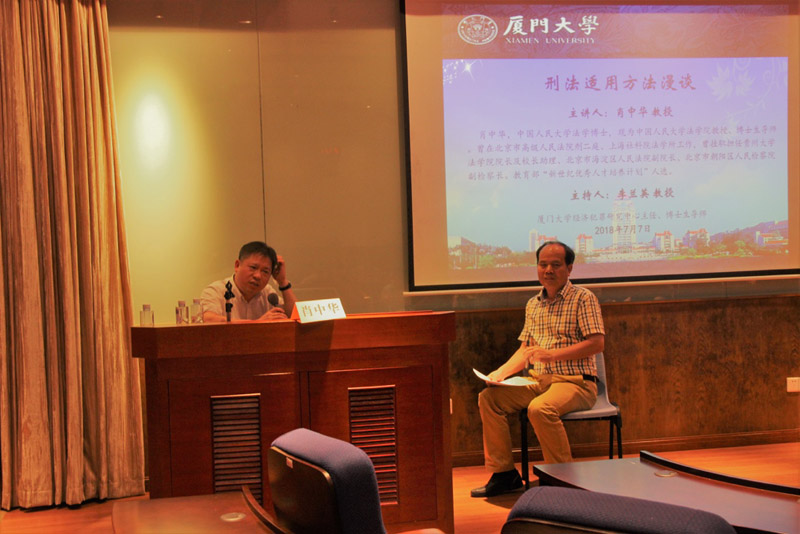 2018年7月7日星期六的晚上,在厦大法学院138教室,正在进行着一场“刑法适用方法漫谈”的学术讲座。主讲嘉宾是中国人民大学法学院博士生导师肖中华教授,主持人是厦大法学院李兰英教授。法学院的郑金火、李晓龙、刘炯、汪东升、王宗涛等教师以及法学院本硕博各年级的几十名学生前来聆听和交流。