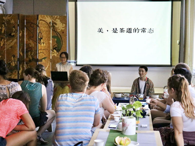 9月19日下午,学生们坐着大巴车来到厦大茶育学堂,跟着陈艳老师一起体验茶文化。在古雅的茶室内,陈老师首先以中国茶的品类介绍开篇并拿出几种茶叶让学员们观看品尝,随后以图片和讲述并行的方式让大家了解了茶叶里蕴含的哲学、美学内涵。德国学生们迫不及待的地开始自己动手泡茶,并就品茶的节气、冲泡过程、不同品类茶的功效等问题与老师进行了交流探讨。茶香萦绕中,同学们都品尝了自己亲手制作的茶,并在风景秀丽的顶楼愉快合影,结束了这次茶文化体验之旅。