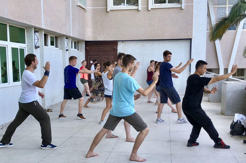9.20下午,由武术老师杨广波老师为特里尔大学的学员们带来了一堂具有中华传统文化特色的武术课。杨广波老师遵循”习武先修心”的中华传统武术精神,在正式开始练习武术之前先教了抱拳礼,并用英语告诉同学中华武术的一些基本理念,包括”仁者无敌”等概念,让学员们在正式开始学习前先理解中华武术的理念。之后,杨老师带大家做了简单的热身后,便开始了正式的练习。学员们练习了从马步、虚步、歇步等基本的步伐到掌法、拳法和勾法等一系列武术动作。在基本练习过后,老师还让大家互相博弈,并在旁边对学员进行指导和示范。