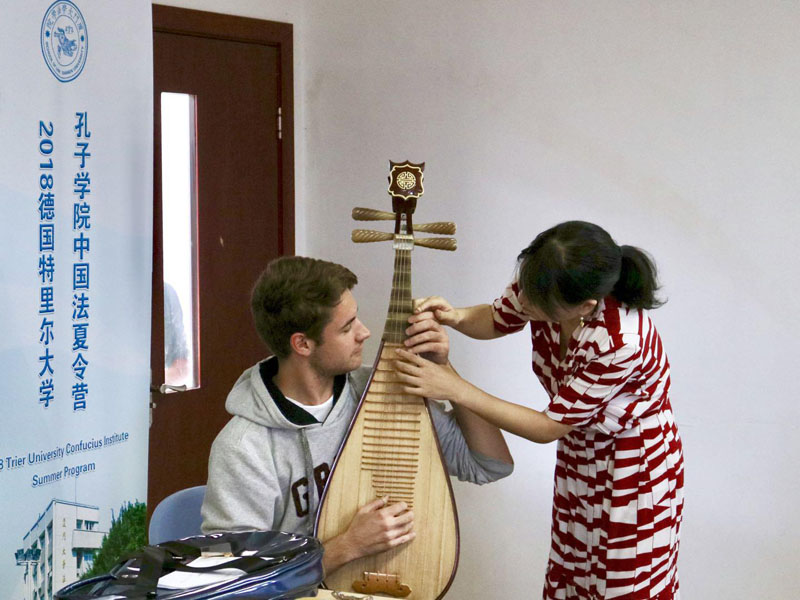9月21日下午,在夏令营接近尾声之际,彭佳老师为特里尔大学的学员们带来了一堂中国古典乐器——琵琶文化体验课。老师首先为学员们大致讲述了琵琶名称的来源、形状的演变以及琵琶的声音特点,在介绍的过程中,彭佳老师亲自为学员们示范琵琶的基础指法。实物教学加上多种琵琶的图片演示,使得学员们对琵琶喜爱颇深。