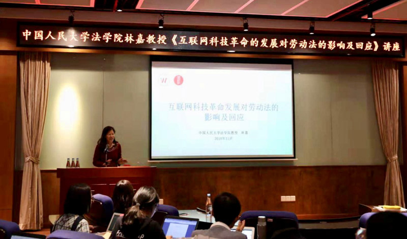 随后,林嘉教授开讲。她首先指出,互联网科技发展给法学带来了极大冲击,无论在公法还是私法领域,这都是热门话题之一,相关院校也成立了研究机构;社会法研究当然应更多地思考科技革命发展带来的影响。其次,她表示,科技革命与对劳动法的挑战目前主要体现在共享经济和人工智能两方面,例如,机器是否会代替大部分的人力劳动?对未来的劳动就业及就业形态将带来怎样影响?平台经济是否会打破劳动法原有的图像?平台劳动关系应当如何认定才公平合理?我国法律是否准备好了应对科技变化带来的一系列问题?林老师认为,过去,劳动法面临的可能多是技术问题,今时今日科技革命已经向我们提出了劳动法伦理问题。她指出,人类必须守住最后一个阵地——情感和灵感,人类可以把理性和逻辑的事情交给机器去处理,而把自己情操发挥得越来越高尚,这发人深省的话语也将讲座推向了高潮。