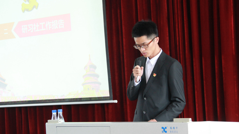 随后,研习社新一届社长张浩同学与第一届社长傅文星同学进行了社旗交接仪式,接过研习社社旗后,新一届社长张浩同学作了题为“接棒新届研习社,扬帆起航新时代”的发言。他从组织上做好团队建设、理论上加强党规党纪学习和实践上开展优秀品牌活动三个方面对研习社接下来一年的工作进行了规划。