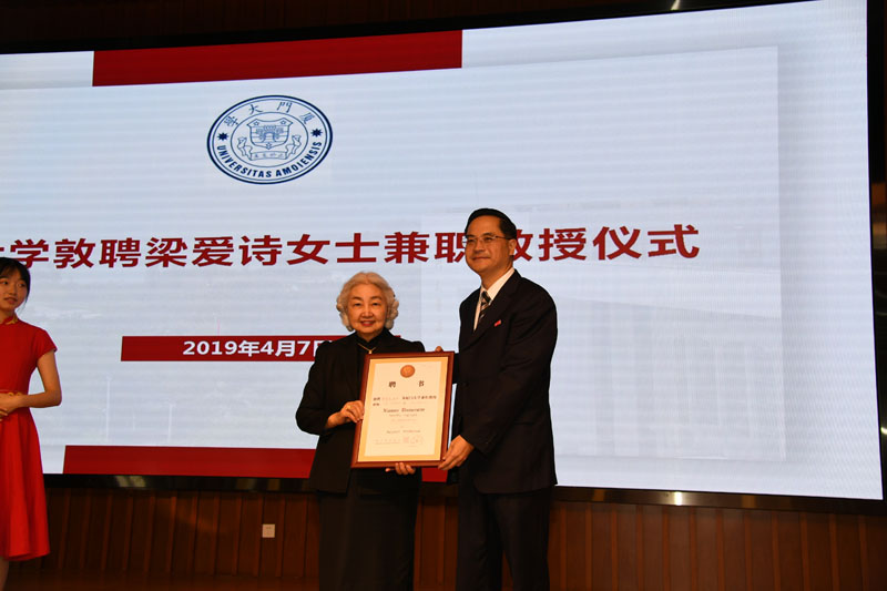 仪式上,邱伟杰副校长为梁爱诗女士颁授pc28开奖结果预测官网刮刮乐兼职教授聘书及南强学术讲座纪念牌。