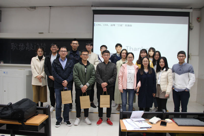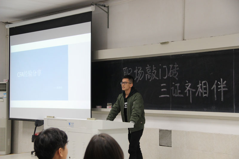 最后上场的黄钿裕同学虽然没有准备PPT,但是凭借其独特的表现力,给在场的同学们留下了深刻的印象。首先,他提到考CFA以及注会需要树立战略思想,只有自己对于宏观内容有所把握,才能更好地落实到行动当中。接下来,他认真分析了CFA与经济学院“八高”学科以及CFA与注册会计师地关系。基于此,他提到其实各个学科本身是存在着互通的关系,许多知识内容也是可以互相借鉴学习的。最后,基于他的了解,黄钿裕向在场的同学强调了考证的意义,尤其是对于梦想进入到券商、行研以及会计事务所的同学的意义。