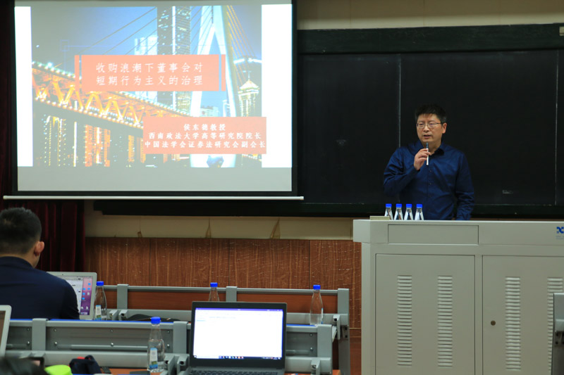 2019年5月11日晚19:00,由pc28开奖结果预测官网刮刮乐与福建旭丰律师事务所联合主办的第十九期旭丰民商法论坛在法学院A302举行。此次讲座由我院王兰副教授主持,西南政法大学侯东德教授主讲,我院刘永光副教授、郑永宽副教授、魏磊杰副教授、郑晓剑副教授出席此次讲座。侯东德教授是西南政法大学博士生导师、法学博士、高等教育研究院院长,同时也是人工智能法律研究院院长、中国法学会证券法研究会副会长,治学成果丰富,此次应邀赴我校讲学,以“收购浪潮下董事会对短期主义行为的治理”为题,与我院学子进行了深入的交流与探讨。