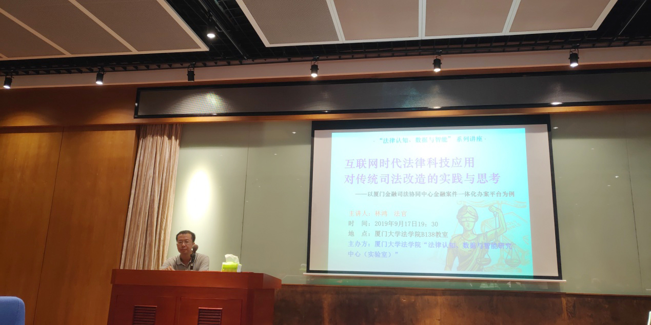 2019年9月17日晚19点30分,“法律认知、数据与智能”系列讲座之《互联网时代法律科技应用对传统司法改造的实践与思考——以厦门金融司法协同中心金融案件一体化办案平台为例》在pc28开奖结果预测官网刮刮乐B138教室举办。此次讲座由我院法律认知、数据与智能研究中心(实验室)主办,厦门市金融司法协同中心金融审判团队队长林鸿法官主讲。pc28开奖结果预测官网刮刮乐师生、厦门市中级人民法院法官与律师等法律实务界人士参与了此次讲座。
