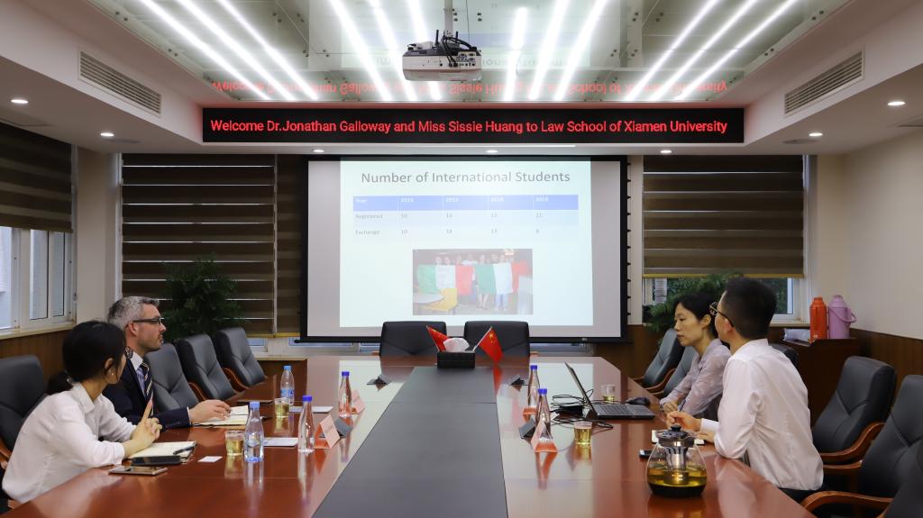 随后,Dr. Jonathan Galloway副部长就纽卡斯尔大学及该校法学院进行了详细介绍,包括师资人数、研究方向、建设投资、国际合作等方面内容,其中着重详述了纽卡斯尔大学与我校已有的合作模式,回顾了往年的合作情况,并就未来期待与我院开展的合作方向进行了细致说明。朱副院长基于我院情况,从合作意向、奖助学金、项目要求等方面与Dr. Jonathan Galloway副部长展开讨论,双方均对未来学院间的合作寄予厚望。