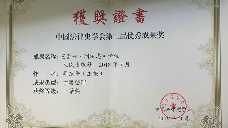 在前不久举行的中国法律史学会成立40周年纪念大会上,我院周东平教授主编的《<晋书·刑法志>译注》获得“中国法律史学会第二届优秀研究成果奖”一等奖。