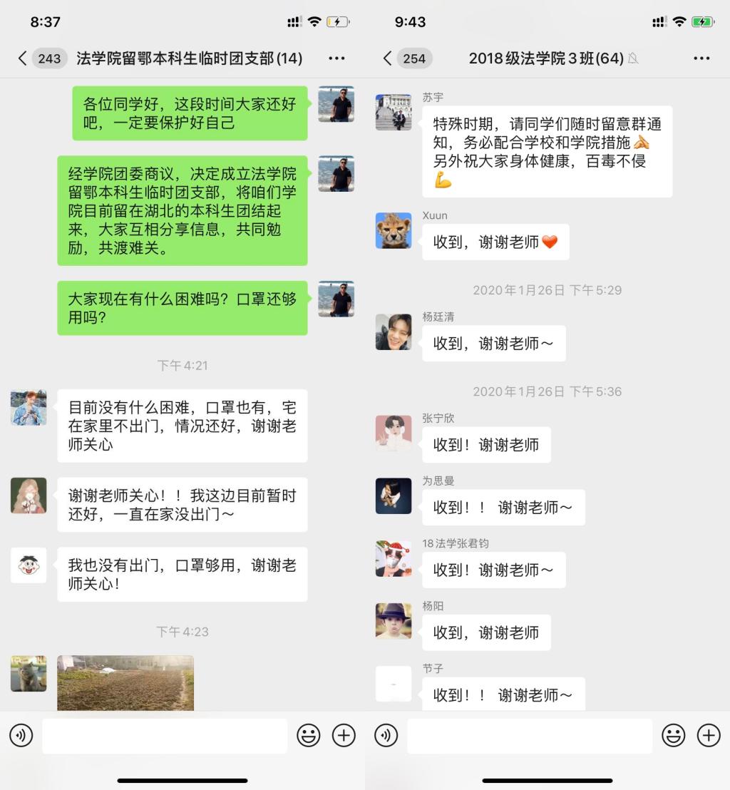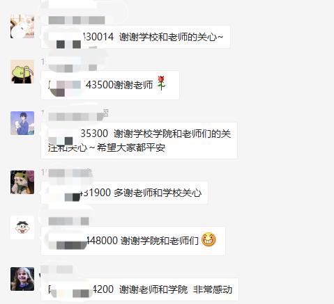 生命重于泰山。学院始终把全体师生的身心健康放在首位。党委副书记、辅导员多次到宿舍关心慰问留校学生,第一时间发放体温计、口罩等物资,并按学校规定进行健康监测,及时劝返想提早回校学生。对身在湖北疫区的学生,开展“5对1”工作模式,每个湖北籍学生均有5个人对接:辅导员每天电话、微信慰问,班主任、导师、党支书、团支书定期进行线上关怀。积极开展“武汉加油”小视频征集、书评影评大赛、厨艺大比拼等丰富多彩的线上活动,让大家在参与过程中愉悦身心,心往一处想,力往一处使,凝聚起众志成城抗击疫情的强大力量。学工组积极开展就业指导和心理疏导,联动就业指导中心和心理咨询中心,帮助学生正视疫情影响、积极调节情绪,缓解疫情所致的学业困难、求职挫折与心理困扰。重点关注离退休老同志,采取分小组对接、全方位覆盖等方式,实时跟进28名离退休老同志的身心状况,做到有困难解决困难、没困难慰问关怀。