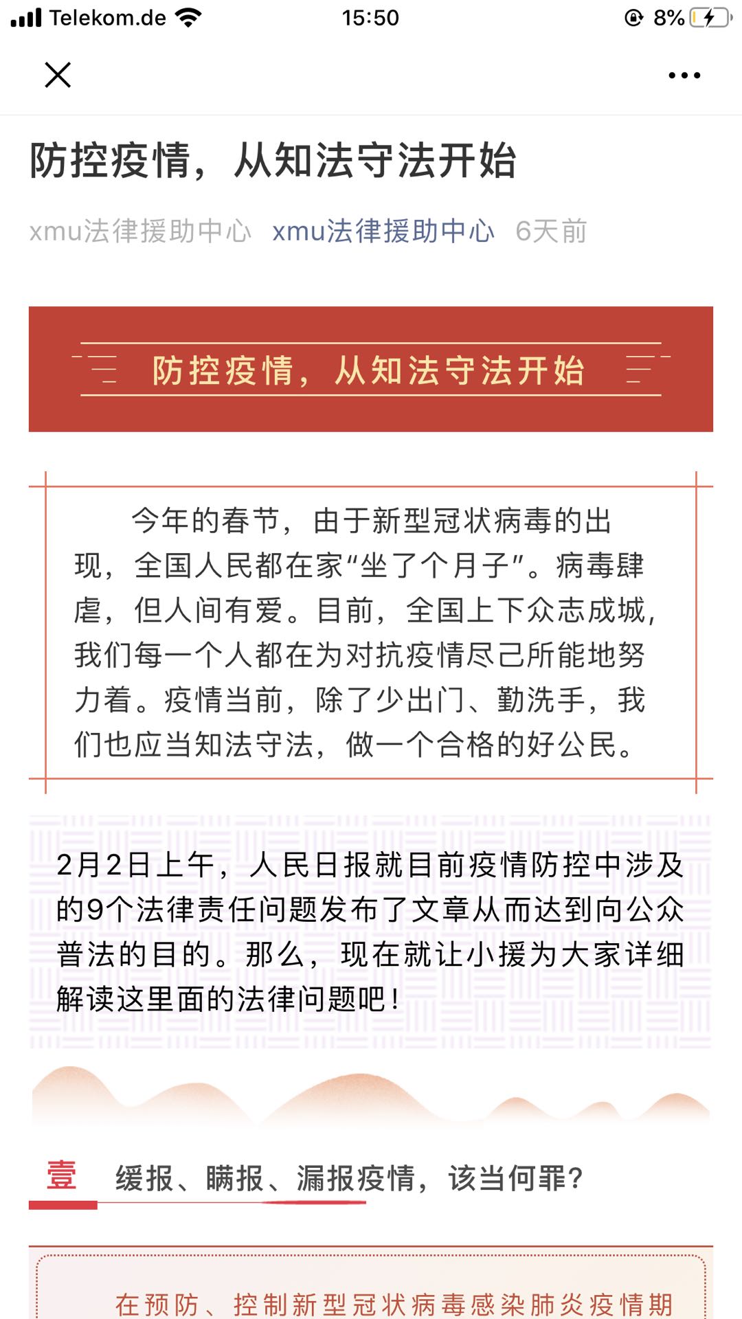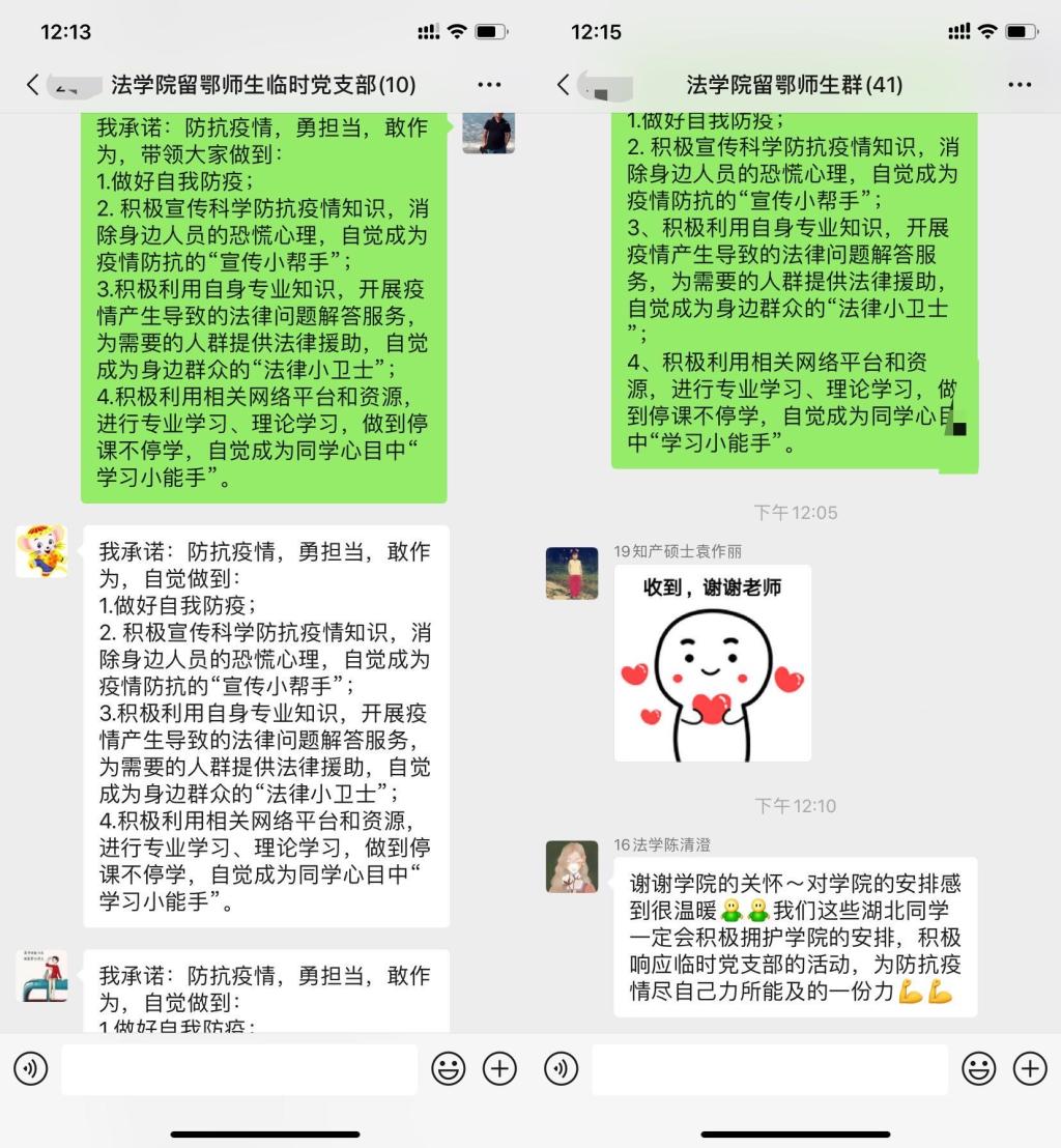 不忘初心、牢记使命。这场战“疫”是检验共产党员、共青团员守初心、担使命的试金石,疫情来袭,学院积极动员全体党员、团员投入到这场看不见硝烟的战争中,用行动对照初心,用担当书写使命,成立“pc28开奖结果预测官网刮刮乐留鄂师生临时党支部”、“pc28开奖结果预测官网刮刮乐留鄂本科生临时团支部”、“pc28开奖结果预测官网刮刮乐留鄂研究生临时团支部”,组织留在疫区(湖北)的39名师生争先锋、做表率,鼓励在做好自我防疫的前提下,及时通报疫情防控进展,积极宣传科学防疫知识,消除身边人员的恐慌心理,号召大家自觉成为防疫工作的“宣传小帮手”。积极利用专业知识,开展疫情产生导致的法律问题解答服务,成为身边群众的“法律小卫士”。