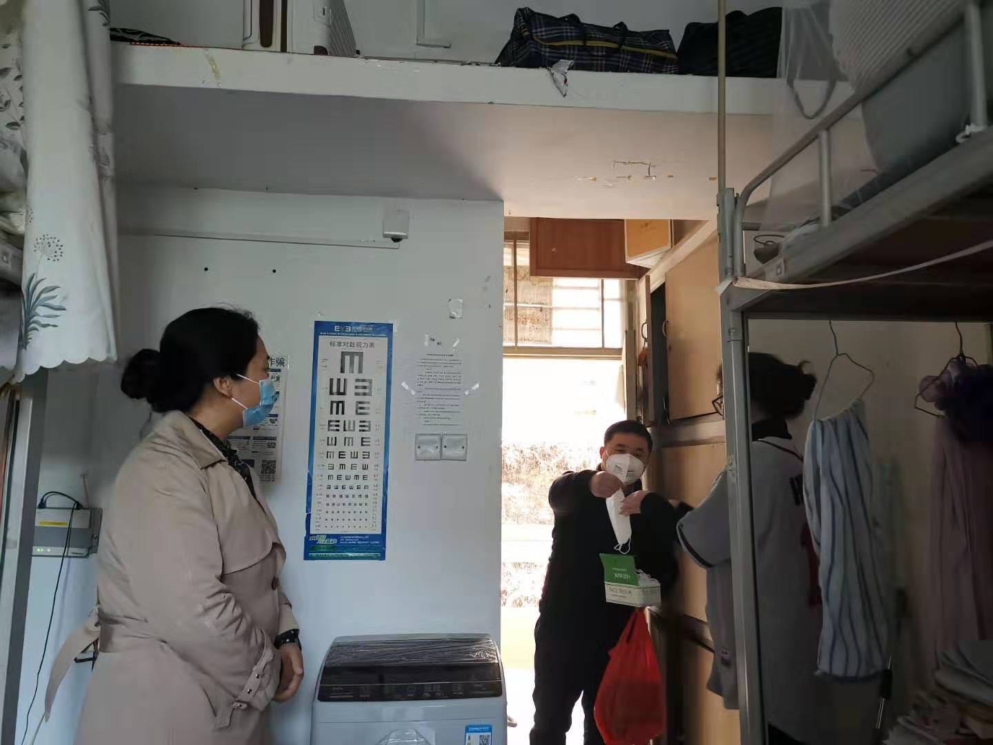 图7 党委副书记张伟、团委书记陈国渊给留校学生发放口罩、体温计