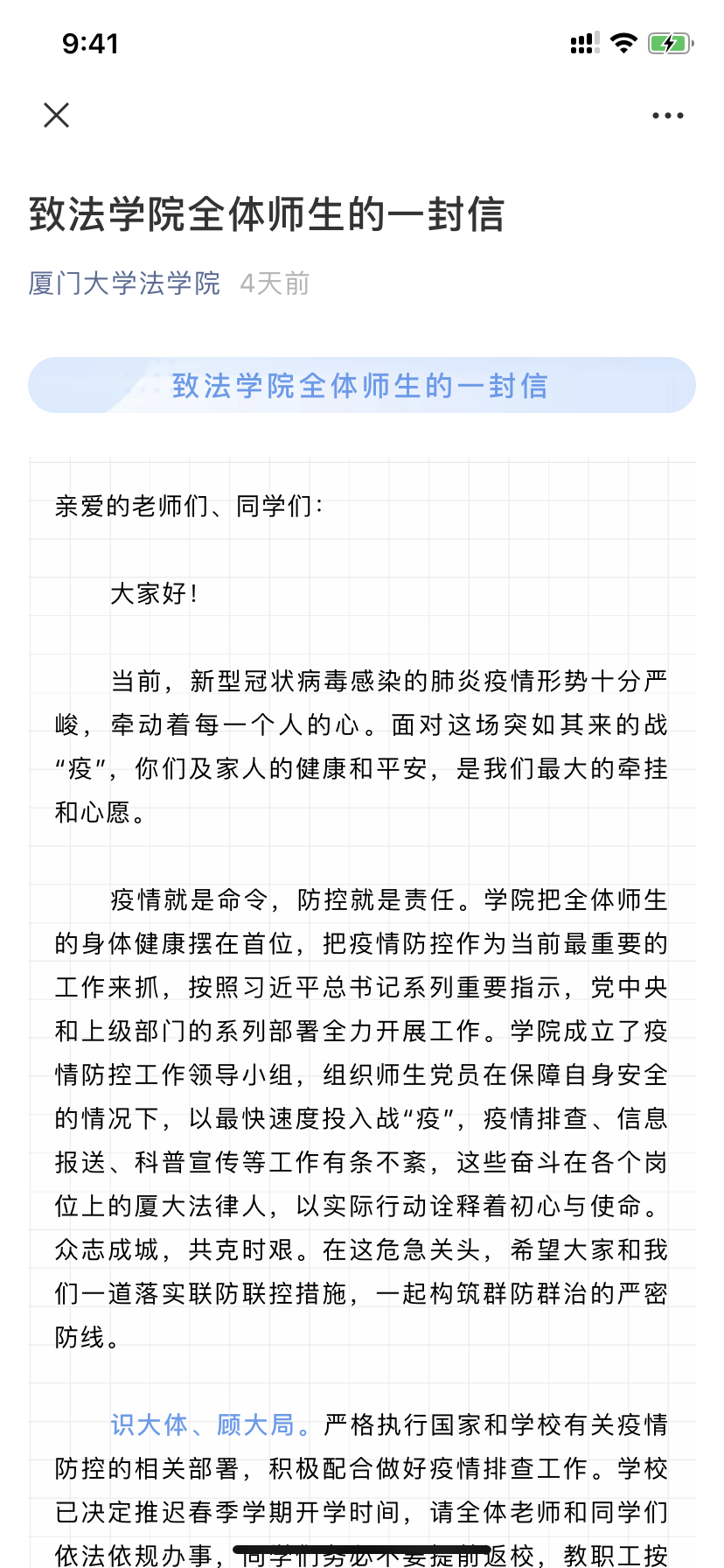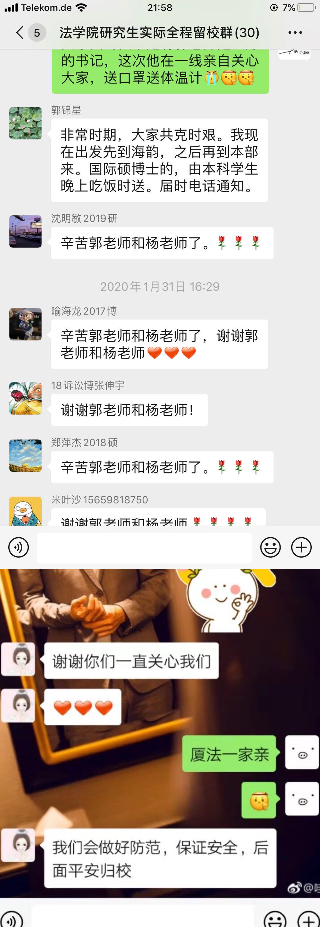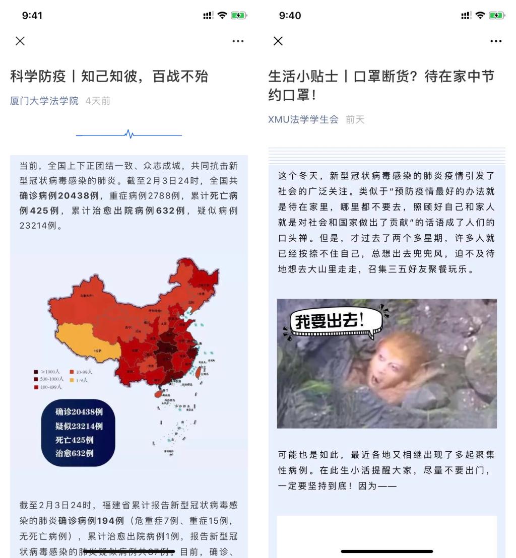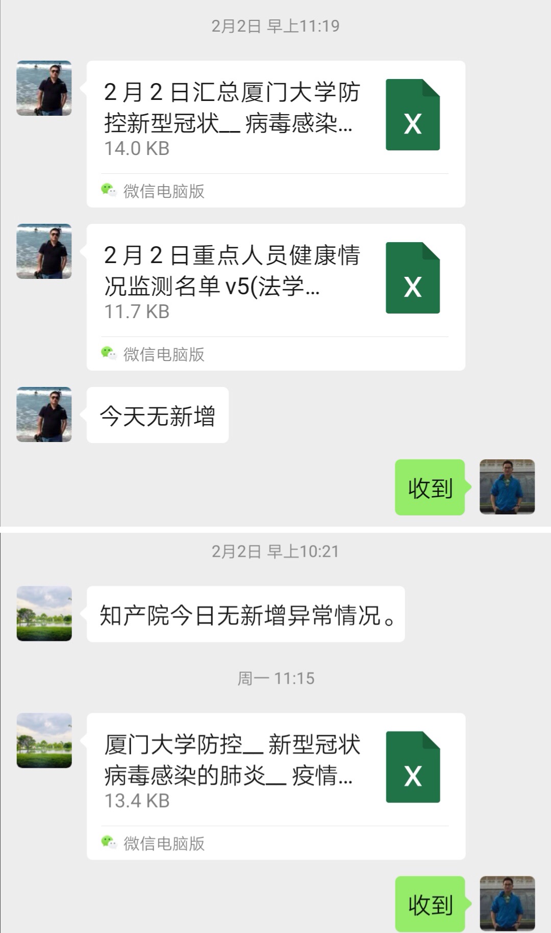 严管就是厚爱。坚决落实联防联控工作要求,学院党委进一步强化阵地意识,做到严防死守,不留死角。学院党政管理干部放弃假期休息,实行每日打卡、“日报告零报告”“人盯人”等制度,认真细致做好师生健康状况监测,全面排查教师、全日制学生、非全日制学生、国际生、交流生等各类群体,及时准确报送防疫信息。积极展开防控疫情的宣传工作,发布《致法学院全体师生的一封信》,凝聚师生抗“疫”共识,定期推送科学防“疫”宣传知识,科普抗“疫”常识。研发微信“每日打卡”功能,按时发送定制消息,实时跟踪学生动态,即使报送异常情况,实现线上与线下全覆盖、高效率摸排。