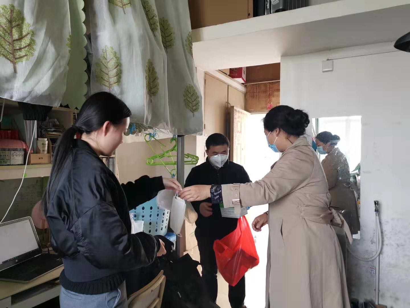 图8 党委副书记张伟、团委书记陈国渊给留校学生发放口罩、体温计