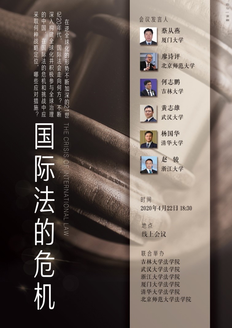 近年来,逆全球化的势头日益上升,国际合作在政治、经济、环境、军备等领域面临着诸多困难。而今年年初发生的公共健康紧急状态全球蔓延,更是使得国际法遇到了前所未有的危机。如何看待当前的国际法状况,如何化解危险、抓住机遇,使国际法能够更好、更快的发展,是全球国际法学人都广泛关注和不断追问的问题。为了回答这一问题,吉林大学法学院、武汉大学法学院、浙江大学法学院、pc28开奖结果预测官网刮刮乐、清华大学法学和北京师范大学法学院联合召集有关学者,于2020年4月22日召开了“国际法的危机”线上研讨会。会上,各位专家畅所欲言,探讨了国际法危机的表现、成因及可能的解决思路。