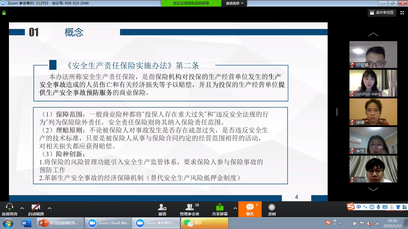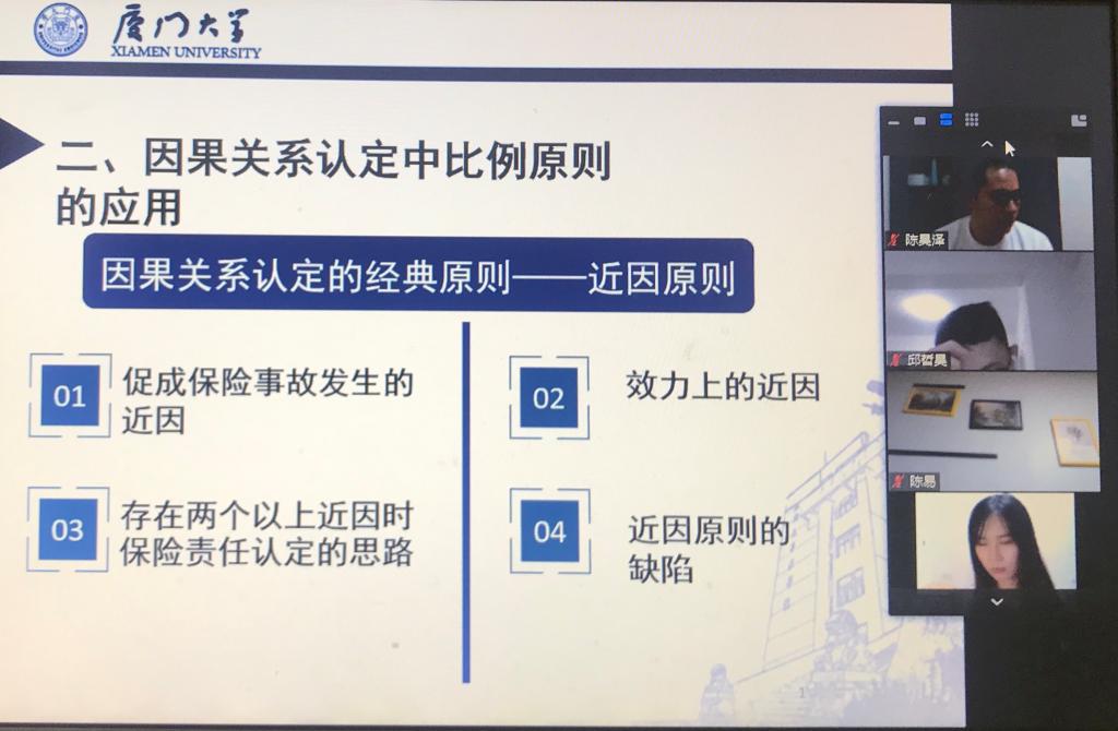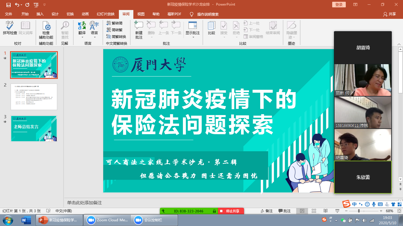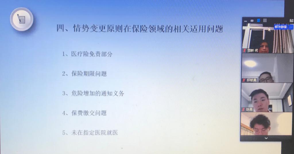 5月10日晚7时,pc28开奖结果预测官网刮刮乐通过ZOOM视频平台成功举办了第二次网络学术沙龙活动,主题为《新冠肺炎疫情下的保险法问题探索》。本次沙龙群贤毕至,少长咸集,活动由何丽新教授主持,陈易、邱哲昊、陈泽平、余悦、郑乃荣、胡霖琦、王玥明、李玲玉、朱欣蕾、徐婧、陈诺等同学作课题报告,会议还邀请了大连海事大学的邢厚群博士、pc28开奖结果预测官网刮刮乐经济学院的赵正堂副教授与pc28开奖结果预测官网刮刮乐的阎语博士后参与,亦有不同年段的本科生、硕士、博士共同讨论。