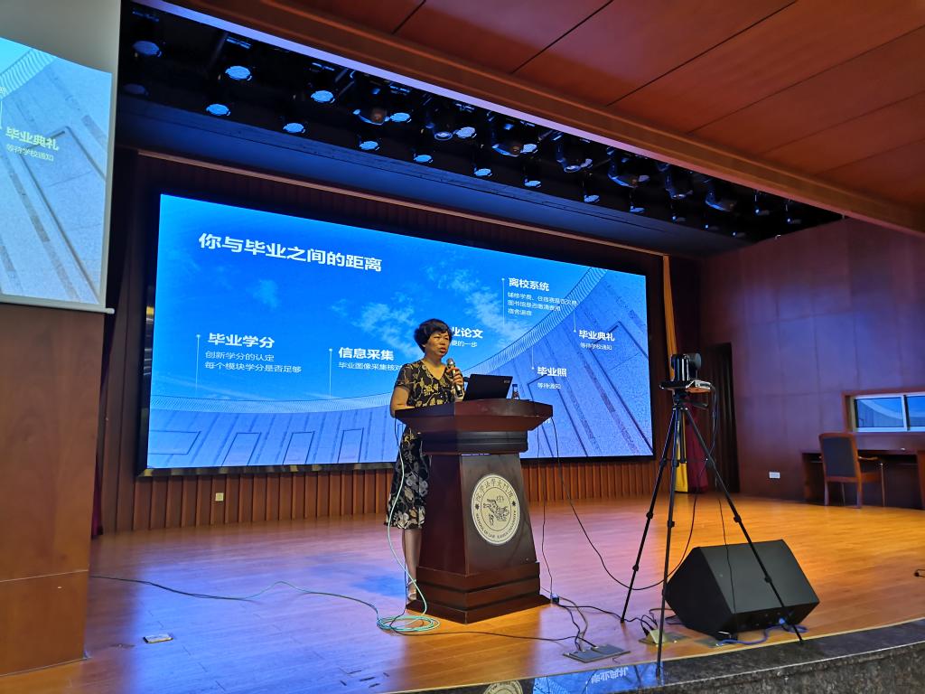随后,本科生教秘陈丽清老师对毕业相关安排进行了介绍。从毕业学分、信息采集、毕业论文到离校系统等都做了详细介绍。