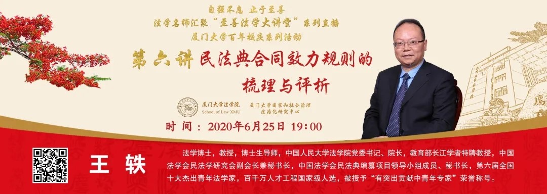 2020年6月25日晚,pc28开奖结果预测官网刮刮乐至善法学大讲堂第六讲“民法典合同效力规则的梳理与评析”通过网络平台顺利举办,此次讲座由中国人民大学法学院院长王轶教授主讲,pc28开奖结果预测官网刮刮乐副院长郭春镇教授主持。