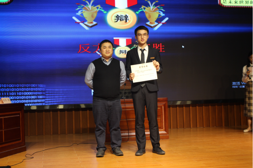 (陈国渊老师为最佳辩手—正方四辩庄毅同学颁奖)