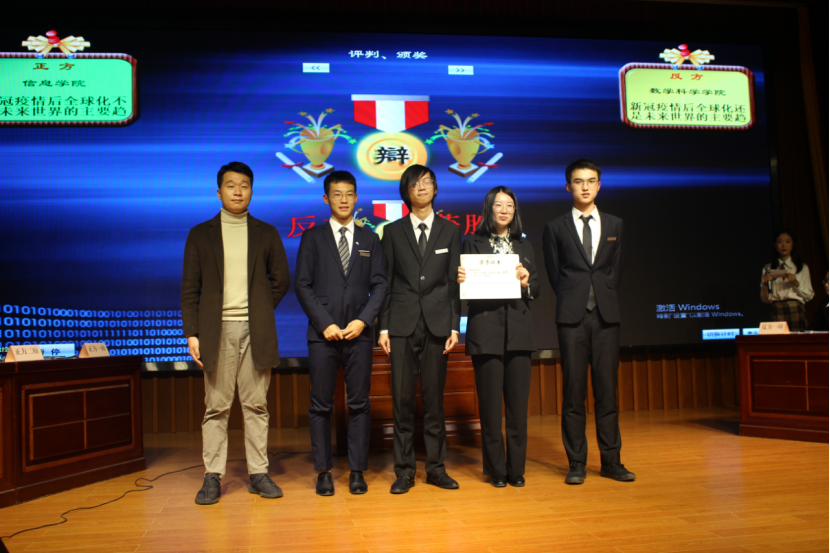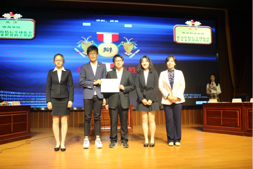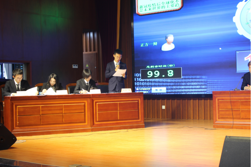 决赛现场,两支队伍以“新冠疫情后,全球化不是/还是未来世界的主要趋势”为辩题展开辩论。