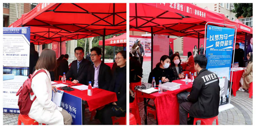 受邀参加本次招聘会的用人单位不仅类型全面,涉及法律、教育、科技等领域,而且数量多、地域广、资质优,得到了同学们的广泛好评。参加本次招聘会的2017级本科生杨景逸表示:“非常感谢学校、学院给我们机会与这么多用人单位面对面交流,也希望我能好好把握这次机会,拿到心仪的offer。”用人单位也对应聘学生的专业素养和综合素质给予了高度评价,北京金杜律师事务所上海分所的律师谈到:“这次活动让我们真切感受到了厦法学子的高素养以及法学院领导老师和同学们的热情,期待与大家下次再相见!”当天下午,学院领导还与用人单位开展了座谈交流,为进一步构建就业合作关系进行深入交流。随后还有部分用人单位在法学院开展了招聘宣讲活动。
