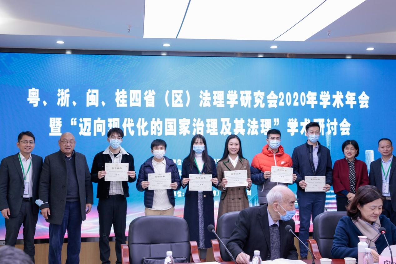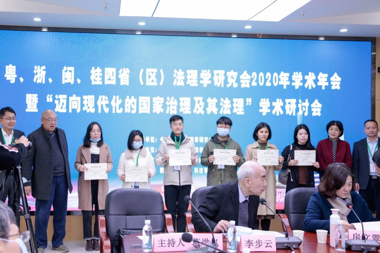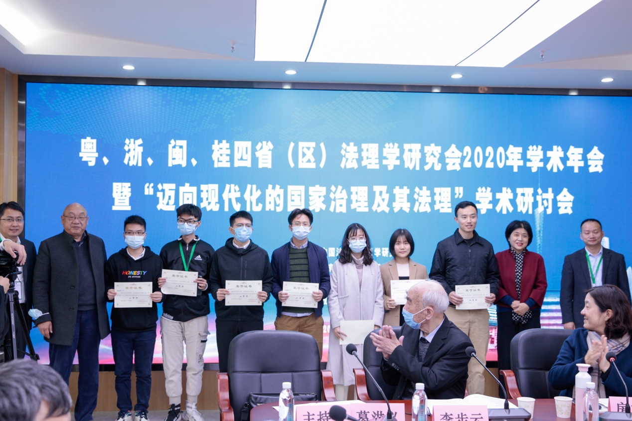 随后,会议进入颁奖环节。会议宣布了优秀参会论文颁奖名单,评选出粤、浙、闽、桂四省(区)法理学研究会2020年学术年会研究生优秀论文,我院法学理论博士研究生李炳辰的论文《论我国立法决策的意涵及其科学化》获得一等奖,我院法学理论博士研究生张可的论文《论政府基于国家安全理由对网络的管制:逻辑、措施与限度》获得二等奖,我院法学理论硕士研究生丁思绮的论文《学生自主权与高校行政权力在校园活动中的冲突与化解——基于软法视角下的博弈论进路》获得三等奖。