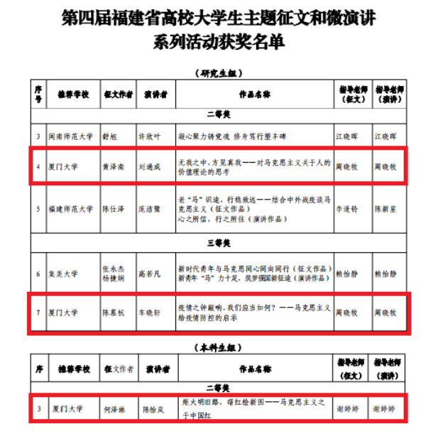 近日,由中共福建省委教育工委主办的第四届福建省高校大学生“马克思主义能够给予我们什么”主题征文和微演讲系列活动评选结果公布,我校共有5项作品获奖,其中3项为我院学子原创作品。我院黄泽南、刘通成荣获研究生组二等奖,何泽琳荣获本科生组二等奖,陈慕杭、车晓轩荣获研究生组三等奖。