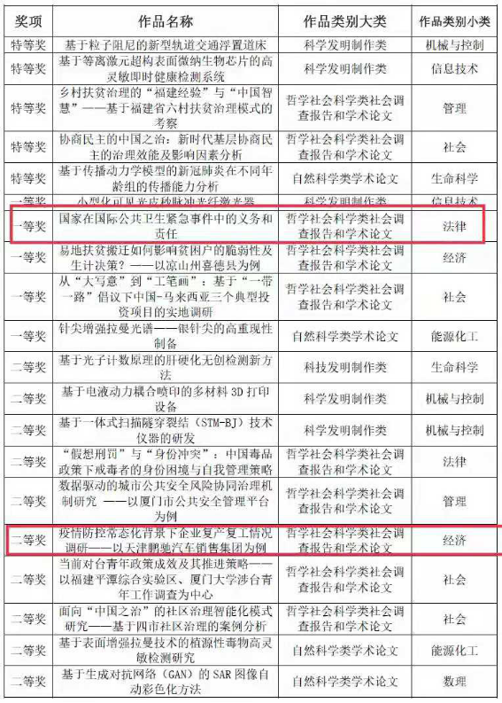 由法学院陈喜峰副教授指导,法学院2018级本科生张锐负责,孙雯、江鹏宇、吴彭雯、赵仪凝参与撰写的作品《国家在国际公共卫生紧急事件中的义务与责任》获得一等奖。该作品以习近平法治思想为指导,以新冠疫情引发的各国如何承担该类国际公共卫生紧急事件中的义务与责任问题为核心,关注中国的抗疫斗争,坚持国内法治和涉外法治相结合,体现法学院学子对加强国际法运用,维护以联合国为核心的国际体系和以国际法为基础的国际秩序,共同应对全球性挑战的关切,展现了法学学子的国际视野。