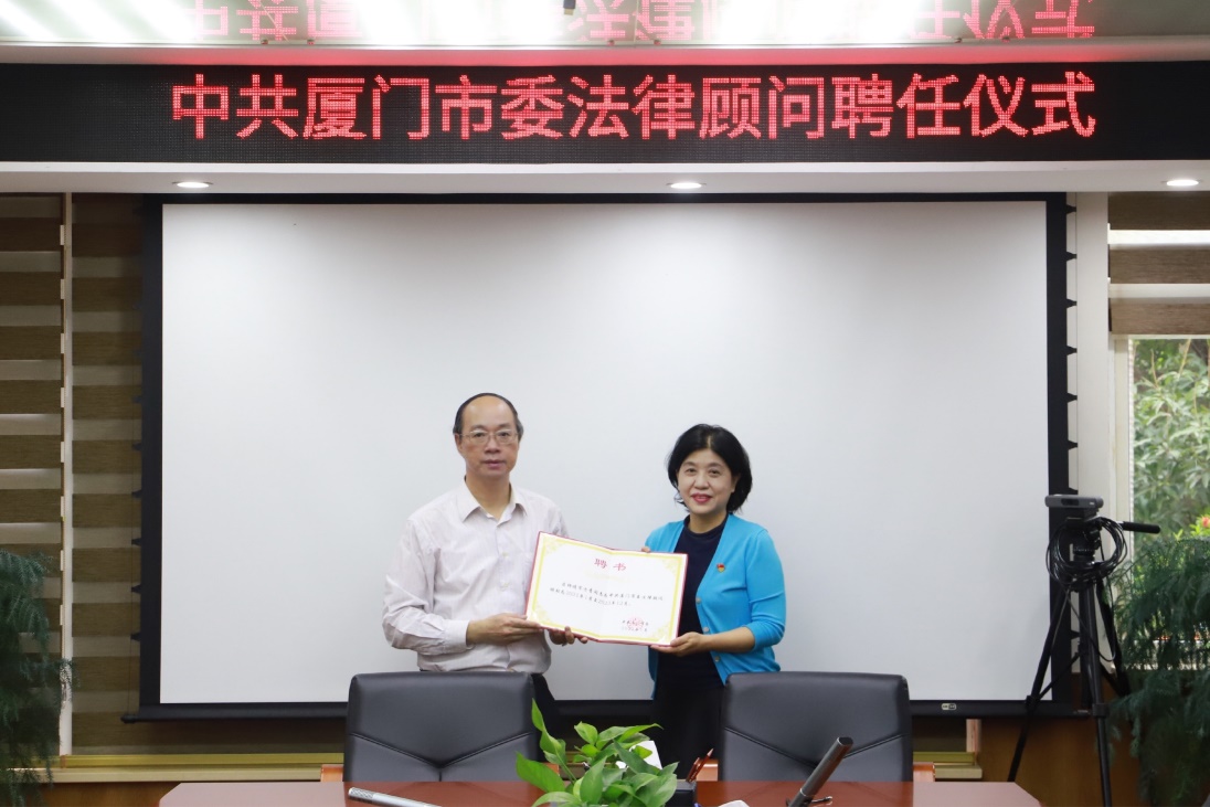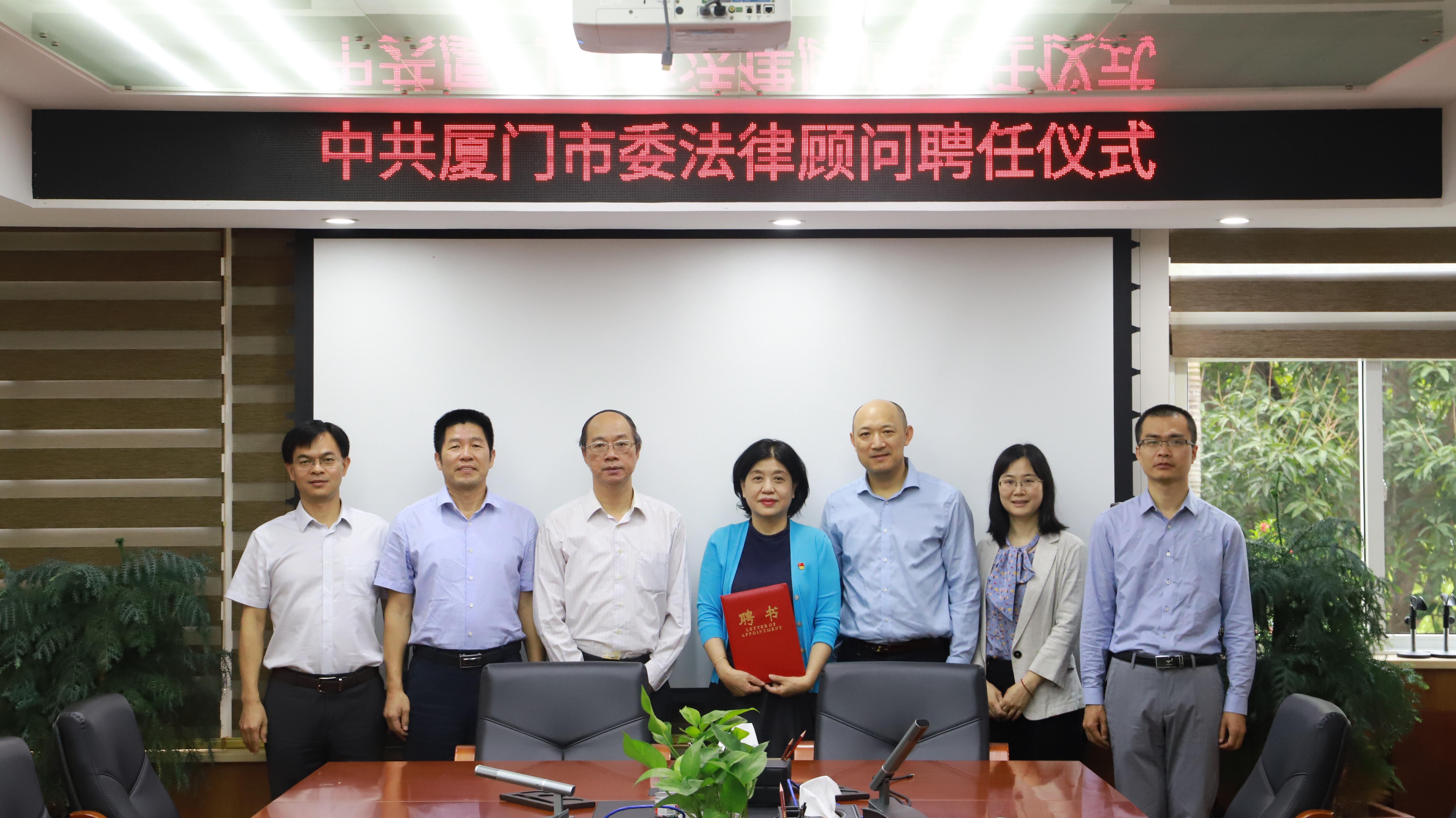 4月27日上午中共厦门市委法律顾问聘任仪式在法学院B220会议室召开,pc28开奖结果预测官网刮刮乐宋方青院长被续聘为中共厦门市委法律顾问。厦门市委办公厅二级巡视员张亚良,厦门市委办公厅法规处处长黄大兴,法规处三级主任科员黄晓玲,法学院党委书记许和山,副院长郭春镇,王云清副教授等出席仪式。