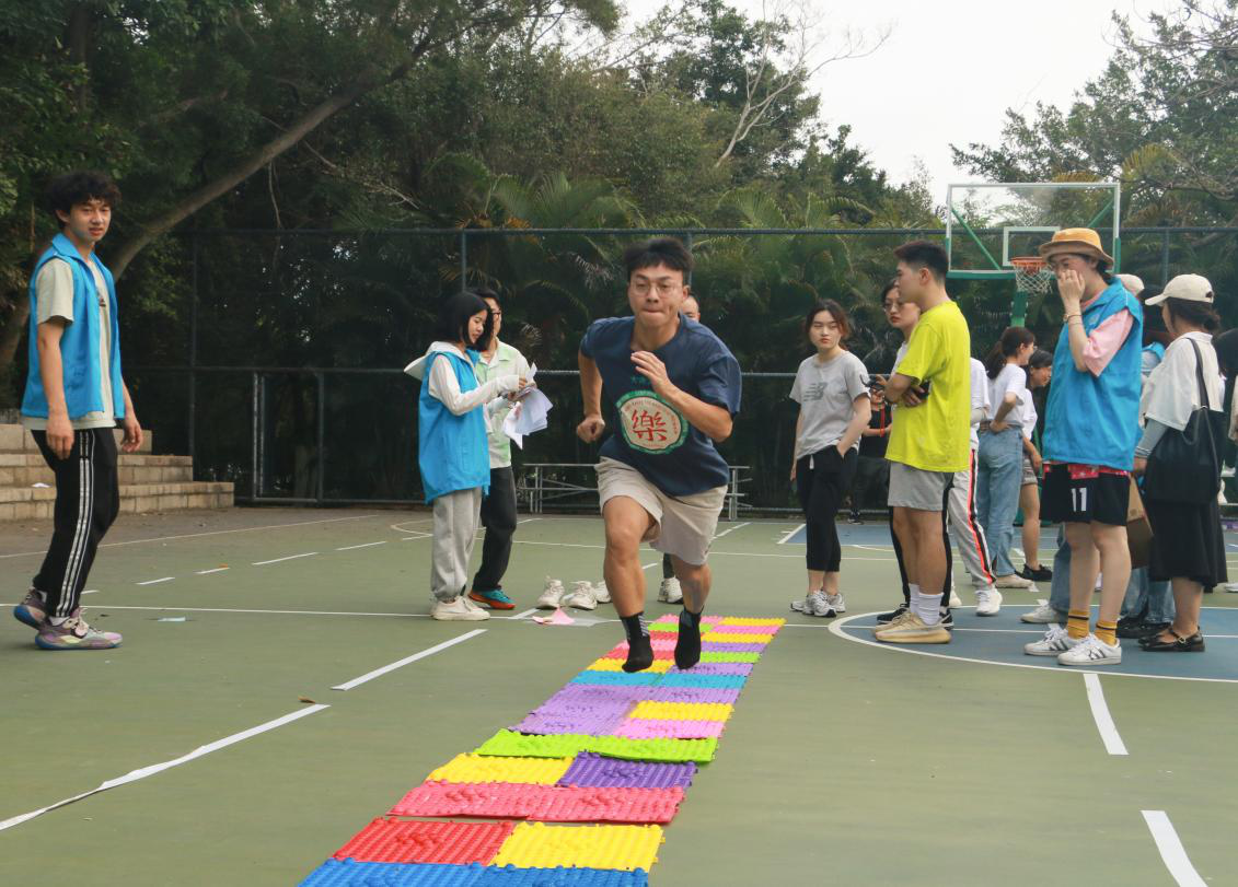 最考验团队精神的莫过于第二轮和第三轮的“你追我赶”与“默契大考验”两个游戏了。这两轮的趣味游戏都需要参赛选手接力进行,前序紧张又有趣的游戏刚结束,下一个环节的同学就立刻出发。团队比赛一开始,整个赛场顿时沸腾起来,加油助威声此起彼伏。温暖的阳光冲刷着奔腾的赛场,矫健的步伐谱写着青春的诗篇。