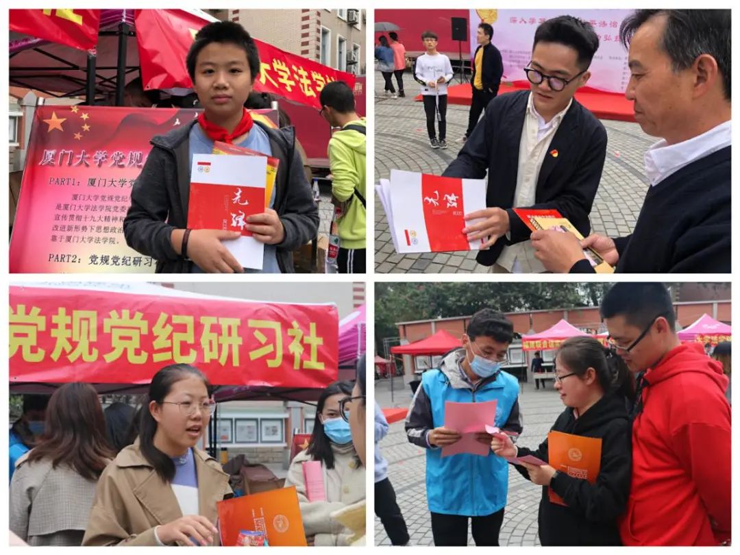 研习社既注重引导广大社员在学习中深入领会习近平新时代中国特色社会主义思想,又注重在实践中将党的创新理论转化为推动社员们日常学习工作的强大动力。2018年5月,研习社联合曾厝垵社区举办以“党规党纪印我心”为主题的“党规党纪进社区”主题实践活动;2019年8月,研习社组建实践队赴江西瑞金开展社会调研,投身革命老区公共法律服务;2020年8月,研习社组建实践队深入厦大挂钩帮扶福建省诏安县,开展民法典宣讲和“四史”学习主题实践活动;2020年10月,研习社组织百名新生党员及新发展党员赴东山县开展 “四史”教育实践活动;每年12月4日,研习社均会在校内外组织开展“国家宪法日”暨党章党规党纪学习宣传教育活动……社团成员们通过组织参加丰富多彩的实践活动,学思践悟的深入与广度得到不断提升。