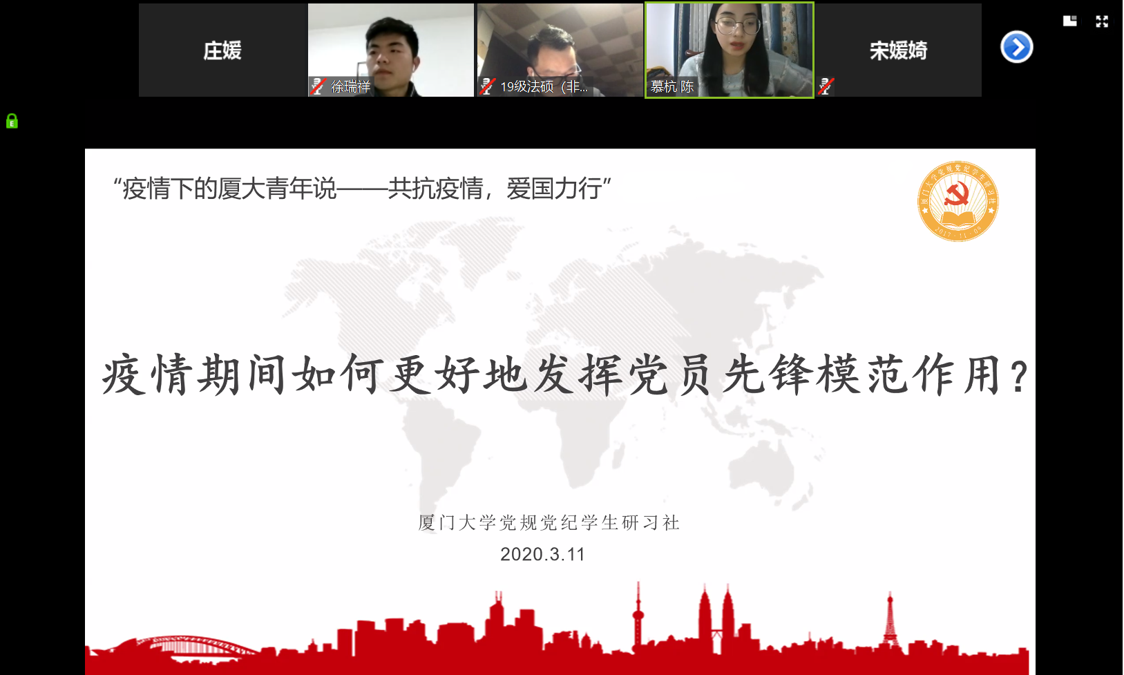 2020年1月底新冠疫情来袭,研习社举办“疫情期间如何更好的发挥党员先锋模范作用”研讨会,并同步发起“抗击疫情,承诺接力”线上活动。社员们踊跃投入到基层疫情防控工作中,彰显了厦大学子的责任担当。